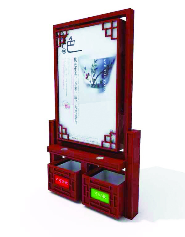 一、垃圾箱與廣告燈箱的完美結合,構成一個有機的整體,上半部分是廣告燈箱,下 半部分是垃圾箱。