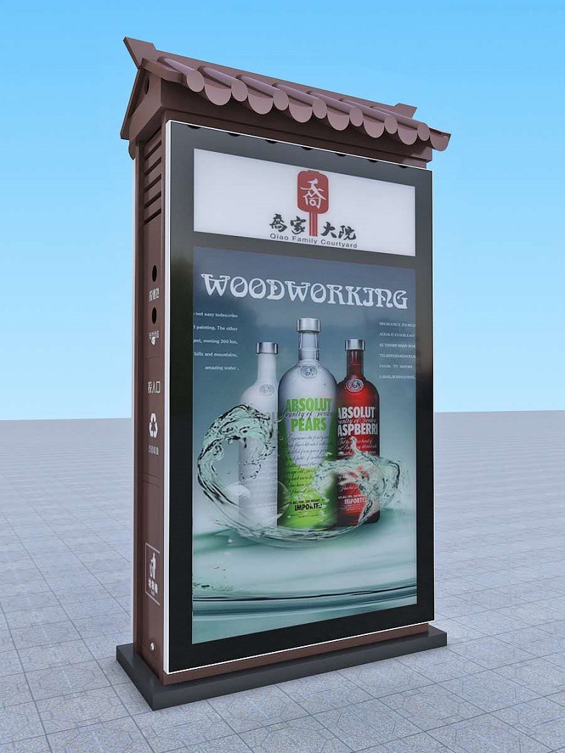 一、垃圾箱與廣告燈箱的完美結合,構成一個有機的整體,上半部分是廣告燈箱,下 半部分是垃圾箱。