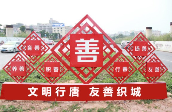 作為社會主義精神的宣揚載體,同時作為城市或者鄉村空間的藝術裝飾物,我們在設計中要重視核心價值觀標牌對空間環境的美化作用。注重核心價值觀藝術性功效的彰顯,并不是一種舍本逐末的做法,兼具實用性與藝術性的社會主義核心價值觀標識牌可以在我們需要它的時候,給予我們心靈上的鼓舞和指引,而我們不需要它的時候,它與周邊環境融為一體、相映成趣,所以我們要尋求核心價值觀功用性與藝術性的一個最佳平衡點,不能顧此失彼,而是要力求兩相得宜。