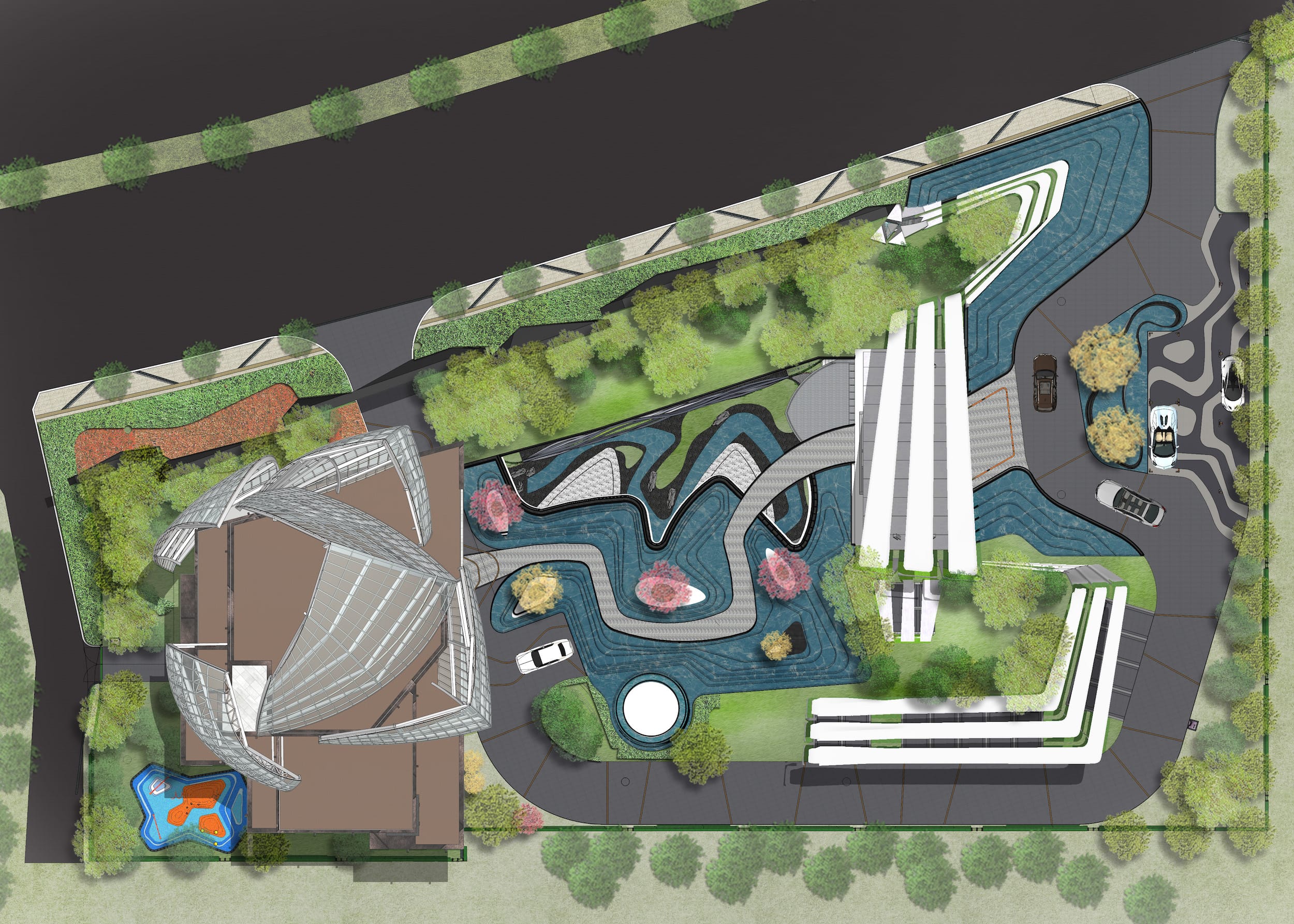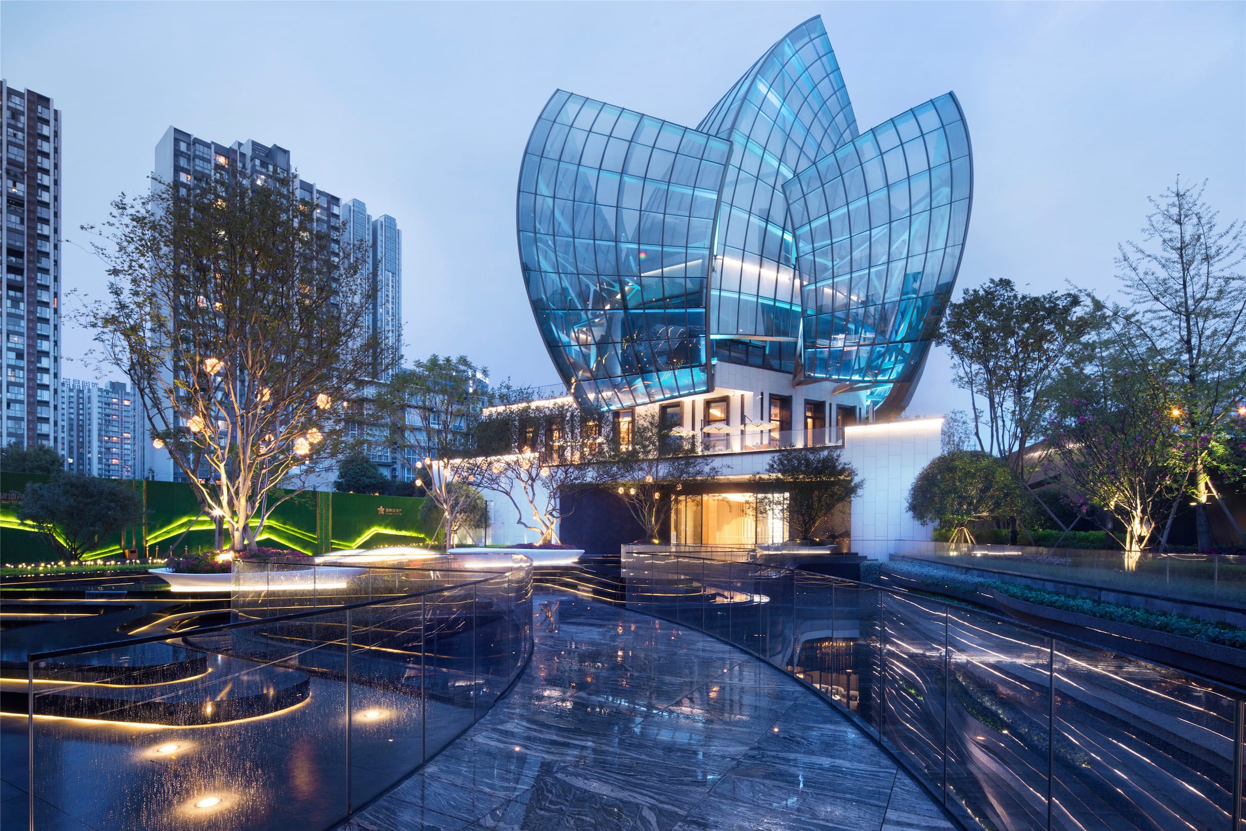 通過科幻感與自然感的和諧營造,體現未來城市花園的前衛性。景觀與建筑和諧統一,各個元素相呼應、未來感的幾何切面和曲線,自然空間中存在的水、光、云、風、花、谷等元素,被轉換為摩登意象里的景觀語言,創造出一個未來生活的藝術花園秀場。