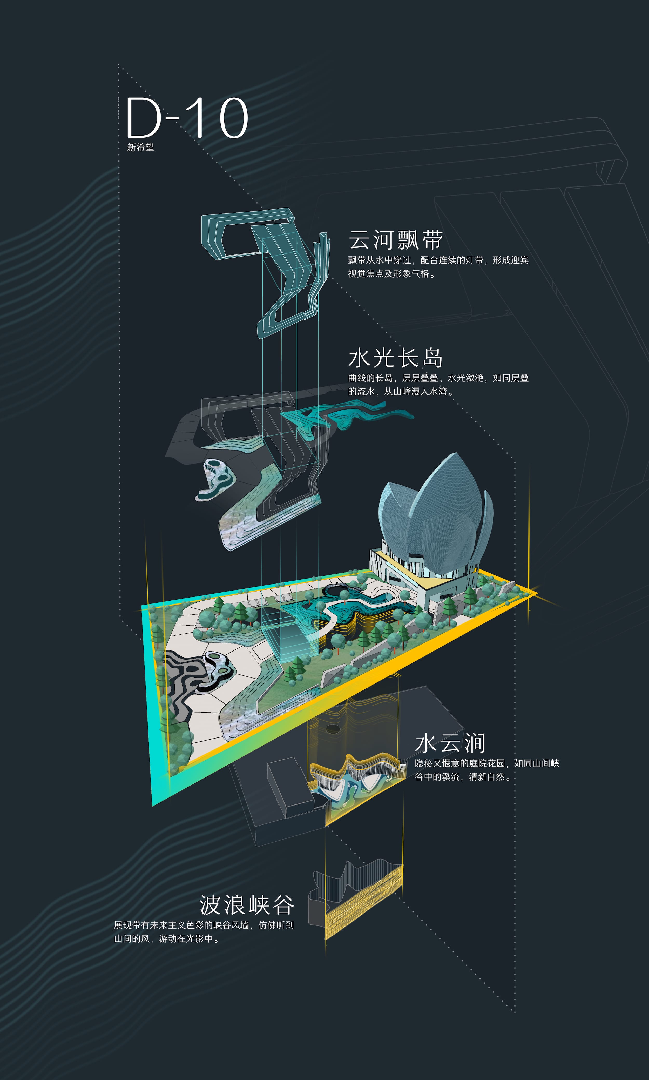 為了實現為未來感的獨特氣質,和高端定位,我們需要的創造一種全新的空間體驗。立體層面的景觀動線成為我們的挑戰點,如何給予參觀者一個多種感官體感的多層次展示空間?在D10中,“層次”是整個示范區體驗的關鍵點。這一次我們建筑與景觀同步進行,另一方面為了增強空間層次,景觀也對建筑提出相應的要求。